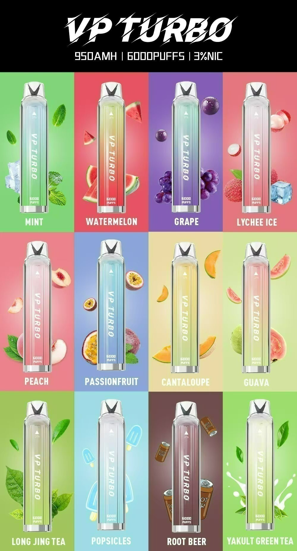 高容量,長續航:VP TURBO 6000搭載950mAh電池與10ml預裝煙油,提供高達6000口的穩定輸出,滿足長時間使用需求,無需頻繁更換。