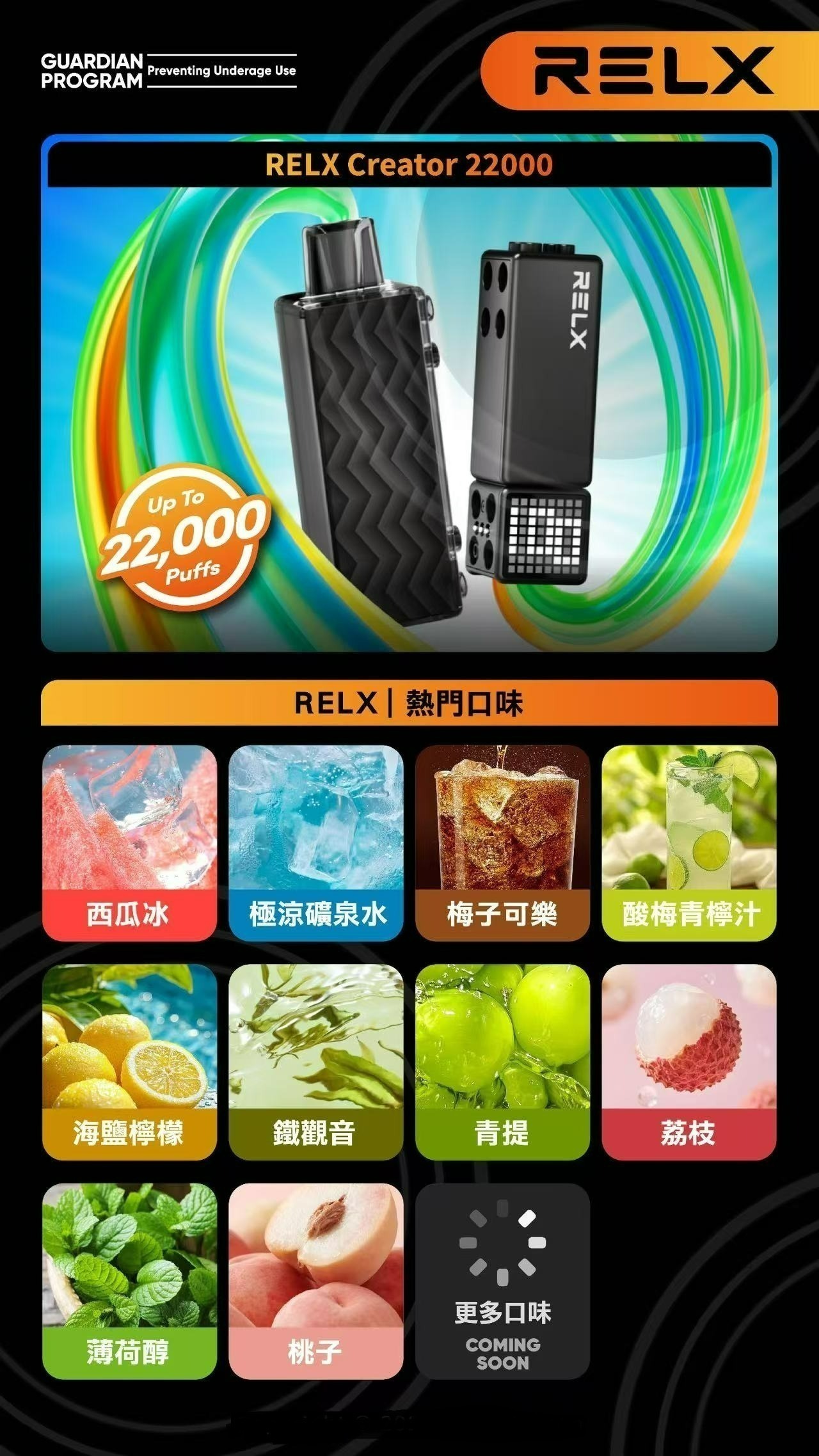 此外,Creator 配備 17mL 超大煙油容量 與 800mAh 循環電池,一次加滿即可滿足長時間使用,最高支援 22,000 口,大幅減少頻繁更換。搭配 RELX 精選的十種人氣風味,帶來豐富的味覺驚喜。